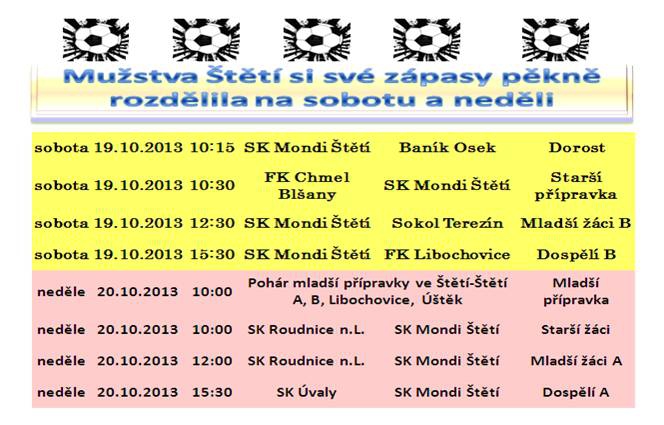 Jedinou akcí na stadionu ve Štětí je v neděli turnaj mladší přípravky se zahájením v 10:00. Jedná se o pohárové turnaje a tento je již 3. v pořadí. Přípravka A je zatím na 1. místě a B tým bojuje s Úštěkem o 3. místo.