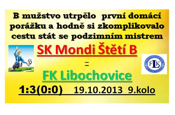 Před zápasem hráči a diváci popřáli vedoucímu mužstva Vratislavu Minárikovi všechno nejlepší k jeho 54. narozeninám. Přidává se i fotbalový oddíl SK Mondi. Zápas měl hodně napovědět, jak se ještě zamotá situace na čele tabulky před skončením podzimní části.Hosté přijeli pouze s jedním náhradníkem. To naše sestava byla téměř kompletní až na Tomáše Gernata, který se raději věnoval jiným aktivitám a týmový duch zůstal hodně daleko v pozadí. Zápas začal tak, jako ty předcházející na domácím trávníku. Vypracovali jsme si mírnou převahu, soupeř bránil a čekalo se, kdy dáme góla. První velkou příležitost měl ve 12. minutě Malý, když prošel středem obrany, ale levou trefil nohy brankáře. Tlak jsme sice měli, ale co nám byl platný, když v té konečné fázi jsme byli úplně neškodní. Hosté nabídli šanci Pilařovi, ale míč sotva doletěl k brance. Kopeme rohy, zahrávali jsme i standardní situace, ale všechno to končilo snadným odkopem míče do bezpečí. Nemohlo to dopadnout jinak než, že se ke slovu přihlásil i soupeř. Po šanci ve 40. minutě zakončené pěknou střelou mohli jít do vedení. Se zakončením minutu před odchodem do kabin na přestávku váhal Peterka a nakonec z toho byl jen roh. Ve druhém poločase se na hřišti objevil Pavel Vaněk, Peterka se přesunul do útoku a právě on ve 48. minutě přízemní střelou dostal naše mužstvo do vedení 1:0. Hosté, kteří do této doby hráli hodně zatažení, začali vyrážet do nebezpečné blízkosti naší branky. Jednou dokonce branku vstřelili, ale pro postavení mimo hru nemohla být uznána. V další příležitosti byl Michal Hudík, ale do rány mu vložil nohu Mencl. Malý posadil míč na hlavu Jansovi, ale ten ho tím správným směrem neposlal. Druhý z bratrů Hudíků Ondřej si s míčem v klidu doběhl až k brance, ale naštěstí volné spoluhráče nenašel. V těchto okamžicích, kdy se začínalo rozhodovat o osudu zápasu, to vypadalo z naší dost bezradně a výsledkem bylo vyrovnání. Předcházelo mu pomalé se vracení k vlastní brance a ponechání Bánovčina vlastnímu osudu. To byla 69. minuta a v 71. už jsme prohrávali 2:1. Mencl odhadl špatně letící míč, obrana za ním se stala diváky na představení hrané Libochovicemi a z vedení nebylo během chvilky nic. Vyrovnáním to zavánělo po centru Vaňka, když se letící míč odrazil od břevna na Jansu, ale ten v těžké pozici netrefil. Co, však nepřicházelo, byla naše převaha a snaha vyrovnat. Stále jsme hráli na půl plynu a vypadalo to, že ani o moc nejde. To hosté mohli přidat i další branky a v 1. minutě nastavení se to Musilovi také podařilo. Výsledek 3:1 byl nečekaný, ale Libochovice si ho za předvedený výkon zasloužily. To, jak působila hra našeho mužstva, dali jasně najevo diváci v závěru utkání, kdy ještě před závěrečným hvizdem rozhodčího Barvy, který jinak pískal velmi dobře, opouštěli houfně stadion. To, že v každém referátu na závěr hráče nabádáme k pravidelným tréninkům, se pro mnohé možná zdá už jako folklór, ale dnes bylo až moc vidět, jak jde dolů výkonnost těch, kteří se na hřišti objevují pouze, když je zápas.