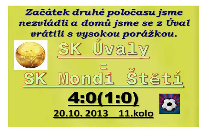 13:13. To byl bodový výsledek našeho mužstva a Úval před tímto zápasem. Při tvorbě sestavy nemohl trenér počítat s 2 vyloučenými v minulém kole proti Lovosicím. Na stadionu na okraji Úval se v úvodu hrál opatrný fotbal s mírnou převahou domácích. Ti, si také hned ve 3. minutě nachystali centr z volného přímého kopu a hlavičku těsně vedle. Jinak možnosti, které se na začátku urodily, byly jenom takové pološance a k úspěchu nevedly. Hezký náběh Stejskala na přihrávku Rejmana nebo na opačně straně střela domácích doprostřed branky. Domácí trenér zřejmě svým svěřencům naordinoval častou střelbu a ti to také plnili, i když přesná muška chyběla. V 19. minutě se v pokutovém území Úval poroučel k zemi Šimral a žádali jsme penaltu. Věřme, že rozhodčí celou situaci viděl lépe a nechal pokračovat ve hře. Možná, že něco bude vidět na video záznamu, až bude zveřejněn. Ve 22. minutě se zčistajasna objevil před Michovským hráč domácích, s míčem začal zbytečně kouzlit a skončilo to trestuhodným zakončení vedle. Soupeř si to vynahradil o 4 minuty později v době, kdy na polovině ležel bezmocně Kucler a naši 2 obránci si s centrem do vápna neporadili. Skončilo to gólem na 1:0. Bohužel jsme přišli i o Vláďu Kuclera , který musel doskákat po jedné noze s pomocí maséra Ransdorfa juniora do šaten. V Úvalech asi někdo nosítka ukradl. V další slibné šanci se ocitlo naše mužstvo, konkrétně Šimral, který prošel po levé straně, nahrál Bendovi, ale tomu míč ideálně nesedl. Úplně zbytečného zkratu se dopustil kapitán domácích, který v přerušené hře nakopl Stejskala a po červené kartě se poroučel pod sprchy. Zůstali jsme i nadále hrát pouze s jedním útočníkem a žádné vzrůšo to před brankou domácích nebylo. Až tedy na 1. minutu nastavení. Zahrávali jsme roh, strkanice před brankou, kde se velké chyby se dopustil Šimral, který zasáhl nohou protihráčovo stehno a musel pod sprchy také. Velká škoda, která naše naděje na úspěch redukovala a navíc, když se k tomu přidala naše střelecká statistka, která nezaznamenala ani jednu střelu mezi 3 tyče, tak bylo v kabině o čem přemýšlet. To jsme, ale ještě netušili, co nás čeká v první čtvrthodince druhého poločasu. Běžela 48. minuta, když si Malík pohrál s Menclem a stejně tak nádherně zakončil do šibenice na 2:0. V 54. minutě selhala naše snaha vystavit protihráče do ofsajdu a Němeček zvyšoval už na 3:0. O minutu později už to mohlo být 4:0, ale Michovský zachránil. Zachránit už ale nedokázal v 58. minutě. Hosté se prohnali po pravé straně bez nějakého většího odporu a zakončení na 4:0 už bylo jenom lahůdkou. Začínal hrozit debakl. To, že jsme hráli bez útoku, protože 2 útočníci mají dištanc, se může jako určitý polehčující argument brát, ale obranná činnost zaměřená na bránění vlastní šestnáctky nějak nefungovala. Naše snaha pokusit se do konce zápasu aspoň trochu korigovat výsledek působila spíše platonicky a domácím jsme až na pár akcí větší starosti nedělali. K naší nejnebezpečnější šanci za celý zápas lze počítat tu, která v 61. minutě na svém začátku vypadala hodně nevině, ale nakonec po hlavičce Slaničky se míč odrazil od tyče. Pak jsme ještě v 66. minutě předčasně zvedali ruce nad hlavu, ale míč celým svým objemem brankovou čáru nepřešel. To výpady do naší otevřené obrany volaly po góle. Hezká kombinace se zpětnou přihrávkou na nabíhajícího střelce skončila míčem vysoko nad. Do posledního šroubku byla naše obrana rozebrána v 77. minutě. Ještě, že střela na závěr byla nepřesná. Výsledek 4:0 je naší nejvyšší letošní porážkou. Navíc jsme přišli o Šimrala, který dostane nějaký ten trest a optimisticky to nevypadá ani se zraněním Vládi Kuclera. Co se týče výkonu a předvedené hry, tak jejím obrazem je druhý zápas v řadě bez vstřelené branky. Jestli, jsme na začátku sezóny hodně branek dostávali, ale také i dávali, tak teď už jenom dostáváme. V sobotu 26. října přijede do Štětí Český Brod. Pojďme najít rezervy, mobilizovat síly a za týden jít do zápasu s cílem vybojovat důležité body.