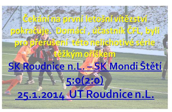 Další těžká prověrka s naším odvěkým rivalem z Roudnice n.L., který se připravuje na jarní část ČFL. Počasí slunečné, ale mrazivé. Do ochozů si našla cestu početná divácká kulisa natěšená na zimní fotbal. Hráčskou lavičku jsme měli hodně širokou. Příležitost dostalo několik nových tváří, které se prezentovali dobrým výkonem, i když proti těžkému soupeři to neměli vůbec lehké. První minuta, první útok na naší branku a skončilo to, jak jen nejhůř mohlo. Než se dezorientovaná obrana stačila rozkoukat, tak jsme prohrávali 1:0. Postupně jsme se vzpamatovali a nájezdy roudnických hráčů jsme úspěšně odvraceli. Domácí byli častěji na míči, rychle kombinovali a obrana měla plné nohy práce odvracet nebezpečí. Dařilo se to však, a když už něco letělo na branku tak si s tím Michovský poradil. Protože jsme museli koukat spíše dozadu, tak nám moc prostoru ve hře dopředu nezbývalo. Zahrávali jsme sice několik rohů a k dispozici byl i volný přímý kop, ale buď to bylo nepřesné, nebo gólman míče ze vzduchu stahoval do svého náručí. V závěru poločasu přiletěl centr do našeho vápna, brankář zůstal přimrznutý na brankové čáře a obránci nechali bez ataku hlavičkovat hráče Roudnice n.L. na 2:0. Do druhého poločasu se sestavy v obou mužstvech hodně pozměnily a byl to náš tým, který mohl snížit na 1:2. Konkrétně střídající Stejskal, který dobře vyběhnuvšího brankáře neprostřelil. Byla to naše největší šance v zápase, ale jinak jsme si toho moc ke vstřelení gólu nenachystali. Když se podíváme na naší střeleckou potenci v minulých zápasech, i těch posledních mistrovských, tak zjistíme, kde nás také tlačí bota. Těch branek jsme moc nedali. Obraz hry se v dalších minutách moc neměnil. Herní aktivita byla na straně domácích. V obranné činnosti jsme se bohužel dopouštěli často zbytečných chyb, situace jsme neřešili tím nejsnazším způsobem, a když už se zdálo, že stačí míč odkopnout, tak jsme provedli něco jiného a domácí hráči okamžitě věděli co s míčem. Inkasovali jsme tak 2 branky. Když už se v závěru zdálo, že to skončí 4:0, tak ve vlastním pokutovém území fauloval Šimral. Střelec domácích se ale moc nevyznamenal. Z penalty trefil jen tyčku. Odražený míč se ale dostal opět do hry a po nedůsledném bránění jsme inkasovali na konečných 5:0. Výsledek vypadá hrozivě. Opět vysoká porážka a tak věřme, že to mužstvo nepoznamená. V tomto týdnu nás čeká opět náročný tréninkový, ale i zápasový program. V sobotu Ostrá a po něm fotbalový ples ve Štětí. Jak ten bude ostrý, to se nechme překvapit.
