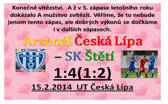 Ještě před 8 měsíci patřila Česká Lípa k ambiciózním celkům České fotbalové ligy. Po odchodu hlavního partnera se propadla o 2 třídy níže a v současné době hraje Liberecký přebor. Náš kolektiv vstoupil do druhé poloviny zimní přípravy a zatím to není po herní stránce zrovna to nejlepší. Nálada v mužstvu není nejlepší a hledají se příčiny nevýrazných výkonů v zimní části. Na krásném, novém umělém trávníku v České Lípě se začalo oboustranně útočně a obrana šla do pozadí. První příjemnou chvilku jsme zažili v 8. minutě po střele Stejskala, když zvonila tyč. Hned z protiútoku to mohlo být jinak, ale domácí se s přesnou muškou nepotkali. V dalším průběhu to bylo z jedné strany na druhou, i když jsme byli o malinko aktivnější, ale v koncovce vždy poslední krok chyběl. V 16. minutě se prohnal po pravé straně jeden z hráčů, který byl v kolektivu, který vybojoval v loňském roce postup do divize, Vít Kala a předložil na podnose míč Stejskalovi, který pravou nohou zajistil naše vedení 1:0. Domácí se také několikrát dostali v prvním poločase do zakončení a Michovský v brance se nenudil. 36. minuta byla vyrovnávací. Míč po centru zprava prošel přes celou branku k zadní tyčí a hráč České Lípy Švehla se už dlouho nedostal to tak lehkého zakončení na 1:1. Vedení jsme si vzali o minutu později zpět. Opět Lukáš Stejskal, který zaběhl za obranu a upravil na 2:1. Ještě před změnou stran byl v dobré příležitosti Tichý, kterému pěkně přihrál Belák, ale skóre se neměnilo. Druhý poločas a to hlavně jeho první polovina patřila našemu mužstvu. Hezký rychlý útok po levé straně rozjel Tichý. Místo střely volil přihrávku a nic z toho nakonec nebylo. To už se nedá říci o dalším nájezdu po stejné straně v podání Dvořáka, který ale tentokrát poslal balón na Rejmana, který se po delším zranění objevil na hřišti a zvýšil na 3:1. V 52. minutě nešťastně odkopl míč golman domácích na kopačky Stejskala a ten mu ho nádherným lobem poslal zpět za záda. Korigovat nepříznivý výsledek 1:4 mohli domácí z volného přímého kopu, ale trefili jenom zeď. Vylepšit střelecký apetit mohl Stejskal po hodině hry, ale z několika metrů z přihrávky Rejmana vysoko přestřelil. Pumelicí v 60. minutě rozezvučel tyč Belák. Jednu z mála šancí ve druhém poločase domácí zahodili v 77. minutě, kdy ani jeden z nabíhajících hráčů míč nezasáhl. V závěru naše hra ztratila tempo. Už jsme tolik nebezpeční nebyli a soupeře pustili několikrát těsně před Michovského. Branka už nakonec žádná nepadla a mohli jsme slavit první letošní vítězství. Na výkonu bylo znát zlepšení a tak věřme, že to vydrží i v dalších zápasech proti těžším soupeřům