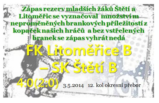 Zápas pro nás začal dost nešťastně, když se ve 3 min. po ruce našeho obránce se kopala penalta, kterou Litoměřice využily a šly do vedení 1:0.V 5 min. jsme se mohli dostat do dobré šance, ale bohužel koncová přihrávka se nám nepovedla.Hned na to se soupeř dostal do protiútoku, ale byly z toho jen dva rohové kopy, které naši obránci bez problémů odvrátili.Pak přišly naše chvíle, kdy v 8 min.postupoval náš hráč sám na branku Litoměřic, ale bohužel brankář ho vychytal. Stejný hráč se v 10 min.dostal do podobné šance a brankář stál opět na svém místě .V 11 min.kopal soupeř roh, po kterém se naši dostali opět do obrovské šance a opět nevyužita.V 13 min přišlana řadu střela štětstkých hráčů, která byla hodně slabá a soupeř neměl velké starosti. V 15 min. přímý kop Litoměřic vysoko nad.V 16min. jsme se rychlý brejk Štěti zlikvidoval brankář domácích.V 17min. při přímém kopu Litoměřic zasahoval brankář Kricner, alee bohužel se při tom zranil. Chvilku to zkoušel, ale nešlo to. Ve 24 min.nás postihla smolná chvilka, když tečovaný míč skončil v naší brance podruhé. Museli jsme vcystídat brankáře a místo Kricnera se v ní objevil Holub.