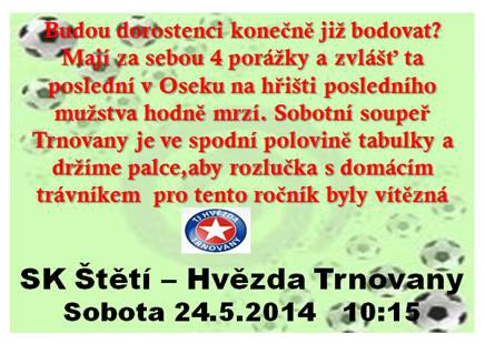 V sobotu 24.5.2014 se hraje na hřišti ve Štětí pouze jeden zápas.