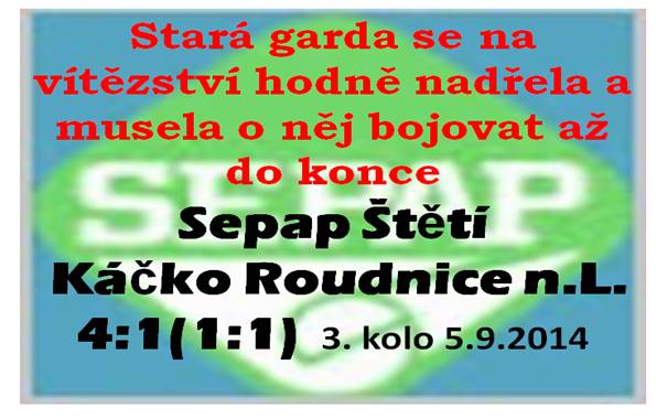 V pěkných dresech s dobovým znakem Sepapu na hrudi vyběhla stará garda Štětí k prvnímu domácímu zápasu letošní zápasu okresní soutěže. Střídačka praskala ve švech a ještě, že realizační tým není tak početný, protože jinak by se na ní všichni nevešli. V předchozích 2 kolech Štětí vyhrálo a úlohu mírného favorita začali plnit již v 8. minutě. Branku na 1:0 vstřelil F. Svoboda. Málem to ale nemělo dlouhého trvání. Hned z protiútoku mohlo být srovnáno. Míč skončil těsně vedle a oddechnutí Michala Müllera v brance domácích bylo slyšet až na vedlejším koupališti, kde probíhala diskotéka pro děti. To bylo ale na dlouhou dobu všechno, co početnou diváckou kulisu za krásného fotbalového počasí upoutalo. Pojistit vedení Sepapu mohl Pixa, ale z pěkné přihrávky míč k bližší tyči neumístil. O něj se většinou starali domácí, ale konečná, rozhodující přihrávka stále nepřicházela. Na své polovině hřiště trpělivě čekající jedenáctka Káčka se kontru dočkala 10 minut před přestávkou. Přečíslení 2 na 1 skončilo vyrovnáním na 1:1. Štětí se sice snažilo ještě do přestávky strhnout vedení na svou stranu, ale exekuci volných trestných kopů je třeba ještě nacvičit. Druhá půle začala náporem domácích, ale všechny 3 možnosti vypracované během 8 minut skončily neúspěšně. Nejprve si Roudnice vstřelila málem vlastní branku, pak zase Libor Pilař jenom těsně minul levou tyčku. Fotbalovou parádu předvedl Šmoula, pardon Toráč, když dloubákem trefil břevno. Tím se ale nábojnice štětského týmu vyprázdnila. Šutér Hamšík to zkoušel rozběhat, ale vedoucí gól ne a ne se dostavit. Hosté, kteří měli na lavičce pouze jednoho náhradníka, úspěšně odolávali, ale postupně bylo na jejich hře znát, že síly ubývají. To se také ukázalo jako rozhodující. 13 minut před koncem zaběhl za obranu Miloš Vála a k radosti všech dokázal poslat míč za záda brankáře. Vedení 2:1 mu ale nestačilo a jako přes kopírák z podobné akce dokázal vstřelit další uklidňující branku na 3:1. Závěrečnou tečku utkání na 4:1 dal Jakub Pilař v poslední minutě. Domácí si vítězství zasloužili, i když o něj museli bojovat až do úplného závěru. Za týden se jede do Hoštky a to je samo o sobě velkým lákadlem se tam jet podívat.
