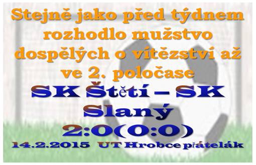 Ve statistikách přátelských a mistrovských zápasů posledních 15 let jsme žádný s dnešním soupeřem nenašli. Pamětnicí a věřím, že je jich mezi námi ještě dost, určitě pamatují přátelské zápasy se Slaným v 80. letech na dnešním štětském stadionu. Ale ani to, nebyl náš dnešní protivník, protože to byl kolektiv Vojenské tělovýchovné jednoty Slaný. Pojďme ale k tomu dnešnímu proti účastníkovi I. A třídy Středočeského kraje. V úvodu se hráči rozhodli šetřit se silami a herní tempo více připomínalo horskou lokálku, která je právě v tom nejstrmějším kopci Alpských velehor. Žádná kloudnější akce nebo střela na branku v prvních 15 minutách vidět nebyla. Do těsné blízkosti branky Slaného jsme se dostali až v 17. minutě, ale skončilo to pádem Blažka v pokutovém území a dle rozhodčího v mezích pravidel. Hlavním arbitrem dnešního zápasu byl Martin Toráč, který se své úlohy zhostil velmi dobře. Navíc měl od probuzení velké starosti, protože zajišťoval asistenta rozhodčího, když mu účast nečekaně skrečoval J.Hořejší. Standardní situace jsme se dočkali o minutu později. Šimral, volný přímý kop nezahrál špatně, ale trefil místo, kde byl připraven brankář. Hosté ve hře dopředu působili živěji a po jednom z rychlých brejků zakončený střelou k bližší tyči musel zasahovat Kloub. Jak bezzubá je koncovka Štětí, jsme předvedli po rohu 10 minut před změnou stran. Nikdo ze 3 hráčů, kteří měli míč na kopačce během chvilky do něj nedokázali pořádně kopnout. Strachovat jsme se museli ve 40. minutě při volném přímém kopu Slaného. Předcházel mu faul Tichého, který jako útočník byl v tento okamžik naším posledním obráncem. Mušku si hráči Slaného ale asi schovali až na jaro. Z ještě větší blízkosti zahrávalo Slané volný přímý kop hned na začátku druhého dějství zápasu, ale výsledek byl stejný. Míč skončil daleko vedle. Jen krůček byl soupeř od vedoucí branky v 50. minutě, ale s šancí naložil bídně. Konečně bylo slyšet z naší lavičky v 55. minutě. Stejskal zatáhnul míč po pravé straně a ke skórování vyzval, z obrany naběhnuvšího Šimrala, který si poradil a zajistil nám vedení 1:0. Ožili jsme a hned to na hřišti z naší strany vypadalo lépe. Kucler vybojoval ztracený míč, ten putoval okamžitě k hlavnímu nahrávači tohoto utkání Stejskalovi, který si všiml za obranu nabíhajícího Tichého v 64. minutě a zajistl dvoubrankové vedení 2:0. Postupně jsme ale zase zalezli do ulity, prostřídalo se několik hráčů, na place se objevili i 2 dorostenci, a i když si nevedli špatně, tak ta sehranost tam přeci jenom nebyla. Příliš mnoho prostoru jsme nechávali hráčům Slaného a ti se 2x ocitli v jasných gólových příležitostech. Darek Doležal v brance musel vytáhnout něco ze svého umění. Korekce výsledku se soupeř nedočkal, a protože i naše ofenzíva vyšla naprázdno, tak jsme se Slaným loučili po výhře 2:0.