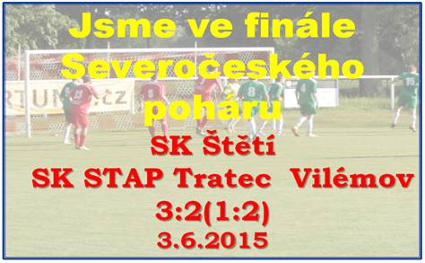 V samém začátku jsme si připravili několik střeleckých příležitostí, které zaváněly brankou. Nejprve po trestném kopu to chtělo více pozornosti a důrazu před brankou. V ještě větší šanci se ocitl Ransdorf, ale ze 14 metrů poslal balón na házenkářské hřiště. Hosté se ale stále častěji začali přesouvat na naši polovinu hřiště a po několika nepovedených finálních přihrávkách to vyšlo ve 27. minutě. Za obránce si do vápna zaběhl Jägr a brankáři nedal šanci. Velmi brzo bylo ale srovnáno. Malák krásným dlouhým pasem poslal dopředu Stejskala, který využil toho, že brankář hostů nebyl při výběhu z branky 2x důrazný a střelou do prázdné svatyně vyrovnal na 1:1 . Aby těch branek nebylo málo, tak o 3 minuty později v minutě 35. šli do vedení opět hosté. Ostrostřelec Kaňkovský trefil míč po náběhu do vápna parádně, přesně do míst, kde se střetává tyč a břevno. Výsledkem 2:1 pro Vilémov skončil i první poločas. Do druhého jsme vyběhli s velkou chutí a v 54. minutě střela Stejskala škrtla břevno. Zvýšit náskok hostů mohl Kaňkovský, ale neuspěl. Vilémov jsme přitlačili na jeho polovinu a s tím přicházely i šance. Belák v 63. minutě netrefil míč ideálně ve snaze přehodit brankáře. Slanička hlavou po rohu jen těsně minul. Šmidrkal trefil spojnici tyče a břevna. Vyrovnání jsme se dočkali v 70. minutě. Velkou zásluhu na to má střídající Tichý, který vybojoval ztracený míč a přihrál ho Belákovi na vyrovnání na 2:2. Při dalším útoku jsme mohli jít i do vedení. Střelu Slanička zastavil pohotový zákrok Michálka v brance. Naše snaha dostat se do vedení nepolevovala a také byla v 73. minutě odměněna brankou Stejskala, který poslal balón nechytatelně pod břevno na 3:2. Inkasovaná branka hráče Vilémova probrala a hned bylo po střele Kaňkovského z těžkého úhlu před naší brankou rušno. Rozhodnout mohl 10 minut před koncem Stejskal, kterého vyzval ke skórování Slanička, ale svoji příležitost zahodil. V posledních minutách utkání se hosté ještě dostali do 2 velkých brankových příležitostí. Nejprve proti střele zasahoval brankář a druhý pokus skončil vysoko nad brankou. Těsné vítězství za výkon ve druhém poločase si naše mužstvo zasloužilo a za postup mu patří pochvala. Ve finále nás čekají Postoloprty, které překvapivě vysoko 6:0 porazili vedoucí tým Ústeckého přeboru FK Litvínov. Kdy a kde se bude hrát, ještě nevíme. V jednání jsou Lovosice nebo Roudnice n.L. Nechme se překvapit.