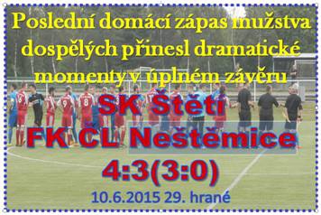 Hned v 1. minutě se také Slanička dostal do nadějné pozice, ale minul. Hosté reagovali aktivní hrou dopředu a ve 13. minutě vyslali první nebezpečnou střelu celého zápasu. Michovský v brance pohotově pokus zlikvidoval. Domácí se rozjížděli pomaleji, ale postupně získávali na vrh a obrana hostů často nevěděla, kam dříve skočit. První zahrozil Stejskal, ale střelu pravou nohou vyrazil brankář Rygl. Ještě důraznějším varováním byla střela Beláka ve 22. minutě, když si narazil balón se spoluhráčem a pak vyzkoušel pevnost levé tyče. Úspěchu se Štětí dočkalo ve 24. minutě. Pěknou zasekávačkou se zbavil obránce Stejskal a přesným zakončením dostal domácí do vedení 1:0. Netrvalo to ani 2 minuty, když míč za letu po pěkném centru hlavou ideálně trefil opět Stejskal a domácí vedli už 2:0. Hrálo se půlhodiny, když se zčista jasna před brankou Neštěmic objevil Matuszewski a už se zdálo, že z toho bude třetí branka v síti hostů. Míč ale i s pomocí teče skončil vedle. Hosté zahrávali několik nepovedených trestných kopů, ale tu největší šanci si připravili ve 35. minutě. Tisíciprocentní příležitost zlikvidoval Michovský a domácí podržel. Štětí odpověděli ryohlým útokem po pravé straně a z přihrávky Stejskala už nebylo pro Slaničku nic těžkého dopravit míč do opuštěné branky na 3:0. Ještě do poločasu mohl výsledek korigovat Paseka z volného přímého kopu z hranice šestnáctky, ale dobře postavená obrana nebezpečí odvrátila. Do druhého poločasu domácí nastupovali se slibným náskokem, který se v 51. minutě začal zmenšovat. Trestný kop z levé strany zasáhl jeden z hráčů domácích, tak nešťastně, až se míč ocitl za zády bezmocného brankáře. Do původních kolejí měl šanci vrátit zápas Belák hned za 2 minuty, ale místo přihrávky volil střelu, kterou gólman vyrazil. Neštěmice ve 2. poločase ožily a hra domácích oproti 1. poločasu začala pokulhávat. V 56. Minutě to také bylo už jen o 1 branku, když se před brankou nejrychleji zorientoval Soukup a hlavou snížil na 2:3. A s domácími mohlo být ještě hůř. To když fauloval ve vápně Poráč a kopala se penalta. Michovský v brance si však na střelce pěkně počkal a míč bravurně vyrazil. Domácí se probrali, že tak by to asi nešlo, pokud chtějí zápas dotáhnout do vítězného konce. Kucler branku Neštěmic těsně minul, stejně dopadl i Tichý, který se z obrany prokličkoval do střeleckého postavení. V 78. minutě postupovali 3 hráči Štětí na 1 obránce, ale Malák zrovna nejlepší řešení nezvolil. To pravé rozuzlení celého zápasu se ale teprve chystalo. Belák v těžké pozici pohotově bodlem branku hostů netrefil a na opačné straně zase střelu Soukupa zneškodnil Michovský. Na ukazateli se rozsvítila 89. minuta, když byl v postupu na samotného brankáře zastaven dost podivným postavením mimo hru Stejskal. Následoval protiútok a rozhodčí Barva neváhal zákrok Šmidrkala potrestat druhou penaltou v zápase. Emoce na hřišti a i mimo něj ovládli dění. Hůlu to však nerozhodilo a z penalty vyrovnal na 3:3. Domácí to hodně rozezlilo a i to někdy může vést k úspěchu. V nepřehledné situaci se před brankou v posledních okamžicích utknání dostal k míči Stejskal a svojí třetí brankou v zápase rozhodl o vítězství domácích 4:3.