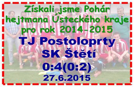 Posledním vystoupením mužstva dospělých fotbalového ročníku 2014-2015 bylo finále O Pohár hejtmana Ústeckého kraje. Velká šance po dlouhých letech získat toto ocenění a fotbalový rok zakončit pohárovým titulem. Hrálo se v Roudnici n.L. na hřišti Pod lipou a soupeřem byl loňský účastník I. A třídy TJ Postoloprty, kterým se podařilo obsadit 2. místo, které se stalo postupovým do Ústeckého přeboru. Podpořit je přijeli 2 naplněné autobusy fanoušků a to údajně třetí měl ještě závadu. Lépe začalo naše mužstvo a už v 1. minutě mohl skórovat Malák. Dostal se ale do těžkého střeleckého úhlu a branku minul. O chvilku později na sebe stejný hráč opět upozornil, ale v tom negativním slova smyslu, když viděl po zásluze žlutou kartu. Krásný centrovaný balón z levé strany poslal v 11. minutě před branku Blažek, obránce skákal naprázdno a za ním stojící Kucler slabší levou noho poslal balón k levé tyči na 1:0. Postoloprty povzbuzované hodně početnou a hlasitou diváckou kulisou, která zabírala půlku hlavní tribuny, mohly srovnat o 2 minuty později, kdy jsme před vlastní brankou nevěděli, kam dříve skočit. Při další akci to soupeř zkoušel z dálky, ale vysoko přestřelil. Trestné kopy našeho mužstva, místo dovolenkujícího se nejlepšího střelce našeho mužstva v minulé sezóně Lukáše Stejskala, zahrával v tomto utkání často Aleš Blažek, ale jeho snahu v 18. minutě odvrátil brankář soupeře. Těžké chvilky před vlastní brankou jsme si často způsobovali nepřesnou rozehrávkou ve středu hřiště a ve 20. minutě jsme uchránili čisté konto jen díky dvěma spolehlivým zákrokům Klouba v brance. V dobrém nebo spíše ve výborném střeleckém postavení se ocitl Belák, ale branku Postoloprt o metr minul. Důležité momenty se odehrály ve 25. minutě. Unikající Šimral byl ze zadu bez snahy hrát míčem trefen Pourem a rozhodčí Suchánek udělil kartu barvy červené. Rozhodčí to v tomto utkání neměl vůbec lehké. Zrovna 2x v rukavičkách se nehrálo a navíc diváci soupeře vyloučení nesli těžce. Myslíme si však, že rozhodčí utkání zvládnul dobře a nikomu nestranil včetně postranních. Kopal se volný přímý kop, na který si nejlépe vyskočil Šimral a hlavou zvýšil vedení na 2:0. Kdo by čekal, že soupeř to vzdá a bude už jenom čekat na konec, tak by se pletl. Další minuty prvního poločasu nebyly z naší strany herně dobré. Škoda, že se 10 minut před přestávkou neprosadil Belák, když jeho střelecký pokus zlikvidoval brankář. Vstřelit kontaktní gól ještě před změnou stran mohl protivník po rohu, ale míči v cestě do sítě chybělo pár centimetrů. Lepší začátek druhé půle jsme si nemohli přát. Levé strana obrany Postoloprt zůstala volná, naběhl si tam Poráč a z na milimetr přesné přihrávky si Tichý nemýlil. 3:0 už bylo více než slibné. Autor 3. branky se pak v 58. minutě při rozehrávce volného přímého kopu soupeře postavil, tak šikovně, že byl míčem trefen, zmocnil se ho a z dobrých 40 metrů poslal míč za záda gólmana, který asistoval při volném přímém kopu. 4:0 a málokdo už by věřil, že by jsme si domů pohár neodvezeme. V 64. jsme přáli branku Belákovi, ale ani tentokrát, když byl sám před brankářem, mu to nevyšlo. Obrovskou šanci měl finálový protivník v 69. minutě, ale trefil jen boční. Čestného úspěchu se Postoloprty nedočkali ani 12 minut před koncem, když se proti postavila levá tyč naší branky. Do gólovky se řítil Gabriel, ale v rozhodujícím okamžiku si míč předkopl daleko před sebe. Naposledy v utkání směřoval míč mezi 3 tyče po střele Poráče, kterou brankář vyrazil. Konec. Pohár hetmana Ústeckého kraje je doma. Gratulujeme. Pohár předávali za asistence fotografů členové výboru Ústeckého fotbalové svazu. Radost měli i diváci soupeře a tak to vypadalo, že spokojenost je na obou stranách. Nyní krátká přestávka a 13. července začíná letní příprava.