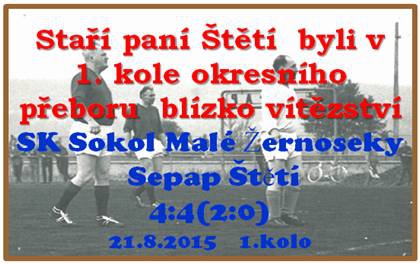 Zápas 2 nováčků byl na programu v prvním kole okresního přeboru, kam naše mužstva postoupilo. Dovolené a zranění, jako třeba Daniela Jermana, kterému jinak přejeme rychlé uzdravení, nedovolilo postavit úplně optimální sestavu. Nejsou to ale výmluvy, ale skutečnosti, které trápí v srpnových měsících určitě každé mužstvo. Prvních 20 minut to na hřišti vypadalo spíše jako seznamovací akce a žádné z mužstev se dopředu moc nehrnulo. Až ve 20. minutě zahrávali domácí roh, na který naše obrana nestačila zareagovat, a prohrávali jsme 1:0. Domácí spoléhali na rychlé útoky a pohyb útočníků soupeře nám dělal starosti. Po rychlém brejku jsme také inkasovali 2. branku a dobře to s námi po prvním poločase nevypadalo. Stará garda Štětí však není tým, který by z boje odcházel lehce poražen. O přestávce se naše mužstvo rozhodlo pozměnit rozestavění na hřišti a brzo také začalo náskok domácích snižovat. Z otočky nejprve Franta Svoboda snížil na 1:2. Jinak Franta byl novináři po zápase vyhlášen, jako jeden z nejlepších hráčů zápasu. O vyrovnání se zasloužil Vála. Domácího brankáře atakoval, tak důrazně, že ten ho při odkopu míče jen trefil a ten doputoval do branky na 2:2. Přátelská atmosféra mezi mužstvy na hřišti nepanovala. O slovní souboje a nesportovní fyzické kontakty nouze nebyla. Dokonalý obrat ve vývoji skóre zařídila dvojice hráčů František Kučera a Michal Hamšík, který mu báječně přihrál do gólového postavení, a bylo to 3:2 pro naše borce. Vedení 3:2 jsme ale dlouho neudrželi, protože Žernoseky brzy srovnaly na 3:3. Na Michalu Hamšíkovi bylo vidět, že se v létě jenom neopaloval a nesledoval přitažlivé okolí, ale i tvrdě pracoval na herní kondici. Jeho přičiněním jsme se 5 minut před koncem dostali opět do vedení 4:3. Už se zdálo, že domů odjedeme s plným bodovým ziskem, když jsme v 90. minutě neuhlídali domácího Tomáše Florka, který určil konečný výsledek utkání 4:4. Utkání bohaté na branky, ale to už k zápasům starších pánů patří. Zápas měl podobu houpačky. Nejprve se radovali domácí, pak zase my a nakonec to skončilo smírně. V dalším kole je volno a další utkání čeká starou gardu ve 3. kole 4.9.2015 na hřišti v Brňanech, kde se utká s 2. celkem loňského ročníku Tigem Nučnice 1996. Držíme palce.