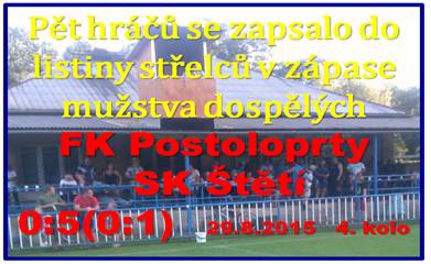 Nováček soutěže, s nímž jsme se na konci června úspěšně střetli ve finále Ústeckého poháru, v minulém kole překvapivě zvítězil v Modlanech. Bouřlivé publikum, kterým je zdejší stadion známý, vytvořilo tu správnou fotbalovou atmosféru, která více svědčila našemu mužstvu. Neuběhly ani 2 minuty a už jsme kopali volný přímý kop za stažení Beláka k zemi. Stejskal však branku o 30 centimetrů minul. V 10. minutě se Mencl spoléhal, že asistent zvedne praporek pro postavení mimo hru, ten tak neučinil a nabíhajícímu hráči naštěstí pro nás míč sklouzl po špičce kopačky. Ve 20. minutě byl blízko šestnáctky Postoloprt faulován pro změnu Malák a druhý pokus v tomto utkání už Stejskalovi vyšel. Krásně kopnutým míčem přes zeď jsme se dostali do vedení 1:0. O 2 minuty později si vzal k noze míč Malák, obešel 4 protihráče, ocitl se úplně sám před brankářem, kterého, jak říkal trenér po zápase, měl obejít také. Volil však střelu, která trefila jenom gólmana. V první půlhodině jsme předváděli pěkný výkon a Kloub v naší brance si poprvé na míč sáhnul ve 24. minutě. Do dobrého střeleckého postavení se dostal i Belák, ale Petr Junek v brance byl na svém místě. Domácí se do tempa dostávali pomalu a v závěru poločasu jsme jim k tomu zbytečnou ztrátou míče ve středu hřiště několikrát pomohli. Vypracovali si také 2 velké střelecké příležitosti. Při té první měl hráč domácích úmysl přehodit brankáře, ale míč skončil za brankou. Při té druhé skvělým způsobem vykryl prostor branky Kloub a více než stoprocentní šanci domácích zlikvidoval. V závěru poločasu se ještě připomenulo naše mužstvo. Slanička levačkou mířil do šibenice a brankář konečky prstů míč vyrazil na roh. Začátek druhého poločasu nám vyšel na jedničku. Ve 46. min.Slanička přistrčil míč Malákovi, z jehož kopačky skončil míč za zády brankáře na 2:0. Domácí jedenáctka byla zaskočena a to jsme využívali i k dalším ofenzivním choutkám. Signál po trestném kopu nám nevyšel, míč skončil mimo hřiště. Stejně, tak neúspěšně to dopadlo i po závalu před brankou domácích, kdy Tichý, Belák, ale ani Mencl nedokázali prostřelit hradbu těl před nimi. V 63. minutě už to ale vyšlo. Belák pláchnul po pravé straně, Tichému míč z jeho sice utekl míč od nohy, ale dostal se ke Slaničkovi, který pohotově zakončil na 3:0. Uklidňující branka, po které se naše mužstvo trochu stáhlo, a toho využili domácí, kteří stále fandícímu publiku chtěli udělat radost aspoň jednou vstřelenou brankou. Proti byl však Kloub strážící naší svatyni a střelu domácího hráče v 67. minutě mezi svými nohami nepustil. Přežili jsme i sérii 3 rohů v řadě a v 71. minutě opět udeřili. Akci založil Tichý, přihrál na nabíhajícího Kuclera, který nebyl na hřišti ještě ani minutu, a pro něj už nebylo zase až tak těžké dopravit míč do sítě na 4:0. Zápas už jsme dohrávali ve velké pohodě a vychutnávali si radost s blížícího se vítězství. Rozhodčí Jiří Sedláček, který řídil zápas perfektně, nastavoval minutu, když právě v tomto čase vystřelil Ransdorf a míč, který následně poletoval od jednoho hráče ke druhému, se dostal na hlavu Beláka a ten stanovil konečný výsledek 5:0.