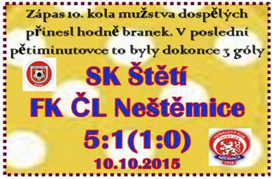 Ve 4. minutě se předzápasové plány málem začaly naplňovat. Stejskal posunul míč na Slaničku, z jehož přihrávky před brankou těžil nabíhající Kucler, ale ještě teď se po nepřesné střele mimo 3 tyče drží za hlavu. Hosté, kteří od úvodních minut spoléhali hlavně na obranu, si v 10. minutě vypracovali 2 rohy za sebou, ale naše obrana byla vždy na svém místě. Nepříjemným momentem byl v 11. minutě faul kapitána hostů Křivana na Stejskala, který musel být dlouho ošetřován mimo hřiště. Nervozitu na kopačkách si na hřiště přinesl Vladimír Kucler. Ve 20. minutě naložil s koncovkou, po akci, která hodně připomínala tu z úvodu utkání, velmi nepřesně. Naše snaha překonat hostujícího brankáře Čermáka se stupňovala. Neštěmice zazlobily pouze střelou z velké dálky, která skončila daleko mimo konstrukci branky. Gól, ale nepřicházel ani na druhé straně. Ve 28. minutě zafungovala hezká kombinace na levé straně, po které se v šanci ocitl Stejskal, ale střelu zlikvidoval gólman. Gól měl na hlavě Slanička, ale strážce branky byl opět na svém místě. Na branku se ale nakonec do druhého poločasu čekat nemuselo. Po centru do velkého vápna se dostal míč až na levou kopačku Beláka a mohli jsme slavit vedení 1:0. Druhý poločas začal 2 trestnými kopy domácích, každý z jedné strany, ale Slanička hlavou mířil vedle a ani signál při druhé dobře proveden nebyl. V 56. min. po docela nevinné akci, kdy se zdálo, že míč je ztracen, ho ještě před branku poslal Stejskal a Belák z nepříjemné pozice posunul Štětí do uklidňujícího vedení 2:0. Po obdržené brance hosté, kterým už nic jiného nezbývalo, pokud chtěli ve Štětí uspět, přesunuli herní aktivitu do útočení. Kopali také volný přímý kop, ale smůla se na jejich kopačky přilepila o něco později v 66. minutě, když se do prudké střely Sukama postavila tyč. V těchto minutách hosté, kteří stále bojovali o kontaktní gól, otvírali zadní vrátka a nám to usnadňovala cestu k rychlým útokům. Belákovi v rozhodujícím okamžiku utekl míč od nohy, když postupoval sám na brankáře. Neúspěšně to skončilo i čtvrthodiny před koncem, kdy jsme opět nedokázali po rychlém brejku a přečíslení hostující obrany, dopravit míč do sítě. To už neplatilo při našem dalším útoku, kdy střelu Tichého z bezprostřední blízkosti stačil ještě brankář vyrazit, ale dorážka Šimrala i s pomocí 2 tyčí skončila gólem na 3:0. V 84. minutě se hezkým zákrokem uvedl Kloub v naší brance, ale o 2 minuty později už po střele Stehlíka k bližší tyči kapituloval. Branky padaly dále. K velké radosti domácích diváků to ale bylo do branky soupeře. Na 4:1 zvyšoval v 87. minutě z hranice pokutového kopu Kucler. Za další minutu dobrou práci předvedli Slanička se Stejskalem a druhý jmenovaný upravil už na krásných 5:1. Neštěmice se se Štětím se rozloučily 2 minuty před koncem, když na zdejším trávníku podruhé v tomto utkání trefily tyčku a výsledek tak zůstal 5:1 pro domácí.