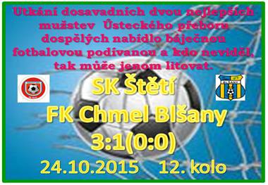 Hledat favorita utkání mužstev na 1. a 2. místě tabulky nebylo jednoduché. Co fanoušek, to jiný názor. Jedno ale bylo jasné, kdo vyhraje, bude po 12. kole na čele tabulky. Zápas začal nepřehlednou situací před brankou Blšan, ale nenašel se nikdo, kdo by dokázal míč pořádně trefit. V 7. minutě se ve vápně Blšan ocitl Belák, ale místo střely zvolil přihrávku, která adresáta nenašla. Na začátku utkání se bylo stále na co dívat. V 10. minutě se po tečované střele Vidličky míč odrazil od břevna štětské branky. Ve 12. minutě se zase hezky do míče opřel Míča a chybělo málo, aby neskončil u levé tyčky domácích. Velká šance se naskytla i Stejskalovi na druhé straně, ale branku Blšan netrefil. S gólovými příležitostmi se po 20. minutách kohoutek přivřel. Hosté měli míč častěji na kopačkách, ale žádné větší nebezpečí z toho pro naši branku nebylo. Až ve 29. minutě měl na hlavě vedoucí branku našeho Malák, ale brankář hostů Jícha si s jeho pokusem snadno poradil. Ještě než se ale šlo na poločasovou přestávku, tak jsme si připravili další jednu tutovku. Hrdý z volného přímého kopu posadil míč na hlavu Slaničkovi, ale tomu se míč po hlavě sklouzl mimo branku. Jestliže v 1. poločase měly Blšany míč častěji na kopačkách, tak ve druhém se to změnilo. Začali jsme nebojácně a střele Beláka z těžké pozice chybělo málo. Vedoucí branka na 1:0 padla v 57. minutě. Šikovnou kličkou se zbavil obránce Hrdý a přesnou přihrávkou vyzval ke skórování Kuclera. Druhou branku měl na noze Malák o minutu později, ale místo okamžitého zakončení se nechal odchytit obranou a navíc z toho byl protiútok, ze kterého mohlo být srovnáno, ale naštěstí pro nás, to skončilo nepříjemnou střelou těsně vedle. Diváci už zvedali ruce nad hlavu, když se zčista jasnae před brankou Blšan objevil Belák, ale míč před ním nabral špatný směr a skončil nad. Šance střídala šanci a v jedné z nich se ocitl Hruška, ale naší branku minul. Blšany myslely stále více na vyrovnání, už se tolik nebránilo a vznikal tím prostor pro naše útočníky. Jeden takový nádherně našel v 64. minutě Stejskal, který viděl za obranu nabíhajícího Beláka a ten svojí desátou podzimní brankou zvýšil na uklidňujících 2:0. Ještě větší pohoda mohla zavládnout o minutu později, ale Stejskal otevřenou branku pravačkou netrefil. To už se pomalu v 69. minutě na naší straně chystalo střídání. Na hřiště přišel Slavoj Tichý, neuběhla ještě ani minuta a už skóroval. Pěkně zaběhl za obranu a nedal brankáři sebemenší šanci. Ve zbývajícím čase už jsme se soustředili hlavně na obranu. Hosté se před naší brankou objevovali mnohem více než za celou předcházející dobu. Nebezpečnou střelu odvracel v 70. minutě Šimral na roh.Na něj si nejlépe naskočil Hruška a hlavou snížil na 1:3. Inkasovaný gól nás ale nerozhodil a v závěrečných 10 minutách jsme si vítězství už pohlídali. Důležité vítězství, které při porážce domácí porážce Modlan v tomto kole znamenají 5 bodový náskok před pronásledovateli.