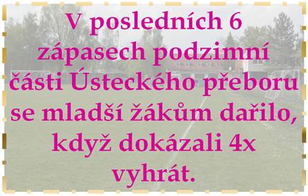 Nezvykle brzy už 23. srpna zahajovali soutěž mladší žáci. Zajímavostí je, že se hraje 3. kolově a to při 12 mužstvech znamená 33 zápasů, což bude pro hráče hodně náročné. Vedení mužstva se před začátkem podzimu ujal František Kučera. V prvním zápase jsme prohráli s tehdy velmi silnými Brozany na jeho hřišti 9:0. Náladu jsme si hned o týden později vylepšili, když jsme po dobrém výkonu ve vloženém kole a dvou brankách Hrdličky a Malechy doma porazili TJ Krupku 4:2. Poslední srpnovou neděli jsme hráli opět doma a se sdruženým týmem FK Litoměřice/Žitenice jsme prohráli tím nejtěsnějším rozdílem 3:2. Druhý venkovní zápas jsme sehráli 5. září opět proti Krupce a vítězství z domácího trávníku jsme nepotvrdili a prohráli 2:1. Druhé okresní derby a druhé vložené kolo jsme bylo na programu 9. září v Lovosicích a do třetice jsme prohráli o jednu branku 3:2. A aby Lovosic nebylo málo, tak hned v neděli 13. září jsme je přivítali na domácím trávníku znova. Odveta se povedla. Po 2 brankách Daniluka a po 1 Hrdličky a Bartka jsme vyhráli 4:2. 7. hrané kolo, 19. září, se do výsledkové listiny zapsalo vysokou porážkou v Duchcově 8:1. Neuspěli jsme ani v dalším kole doma proti Junioru Děčín A. Nepomohli nám ani 2 branky Kuči a prohráli jsme 5:2. S FK Litoměřicemi 4. října na jeho hřišti jsme prohráli 7:1, když o všem se rozhodlo v 1. poločase, který jsme prohráli 6:0. O 7 dní později nás čekal další venkovní zápas proti vedoucímu mužstvu tabulky SK Roudnici n.L. Prohráli jsme sice 3:0, ale špatný výkon jsme nepodali. 18. října nás čekal první ze čtyř domácích zápasů v řadě. S chutí jsme si v něm zastříleli a porazili Neštěmice 9:5. Střelecké hody mladších žáků pokračovali i 25. října, když si na své konto připsali 3 body po vítězství na 9:4 nad Juniorem Děčín B. Pak jsme sice ve vloženém 16. kole doma branku nevstřelili a prohráli s Duchcovem 1:0, ale všechno jsme si vynahradili v posledním domácím zápase letošního roku, když jsme zvítězili nad Sokolem Brozany vysoko 13:4. 4 brankami se blýskli Ivanič a Bartko. Podzim mladší žáci zakončili dvěma venkovními zápasy. 8. listopadu prohráli v Mlékojedech s FK Litoměřicemi/Žitenicemi 2:0 a radost nám udělali na úplný závěr, když dokázali zvítězit 3:2 nad sdruženým týmem TJ Sokol Košťany/Oldřichov 3:2. Z 16 zápasů jsme 6 vyhráli a 10 prohráli. Ve vyrovnané tabulce, hlavně v jejím středu, kde mezi 5. až 10. místem je rozdíl pouhých 5 bodů, nám patří 8. místo. Hráčům přejeme pěkné vánoce a hezkou zimní přípravu. Realizačnímu týmu, trenérům Františku Kučerovi, Miroslavu Danilukovi a vedoucímu Tomáši Gernatovi patří poděkování za práci při výchově mladých fotbalistů.