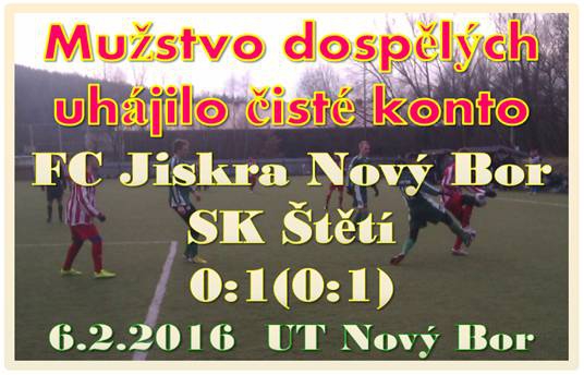 Na oblíbeném místě ve Sloupu v Čechách se od středy do neděle 7. 2. 2016 mužstvo dospělých připravovalo na jarní část soutěže. Ve 3 fázových trénincích získávalo fyzickou kondici a tak se všichni určitě těšili na přátelský zápas v Novém Boru proti domácím, i když v nohách cítili naběhané kilometry a věděli, že proti účastníkovi divizní soutěže je procházka rozkvetlým sadem nečeká. Domácí zahájili aktivním napadáním v hlouby naší poloviny hřiště. Nějaký čas se jim to dařilo a našim hráčům chvilku trvalo, než se herně našli. Na programu byli v první desetiminutovce 2 trestné kopy na každé straně po jednom, ale obraně to žádné velké starosti neudělalo. Gól měl na hlavě po rohu Šmidrkal, ale nikým nehlídán branku domácích netrefil. Hezký průnik po levé straně naší obrany jsme zaznamenali ve 12. minutě, ale útočník domácích se s přesnou koncovkou nepotkal a branku vysoko přestřelil. V nadějné příležitosti skórovat se ocitl Lelek ve 20. minutě. Dostal se však do hodně těžko úhlu a úspěšně zakročil i brankář Nového Boru. Po půlhodině hry, kdy už jsme hráli v určité herní pohodě, jsme si také vypracovali 2 rohy za sebou a hlavně před tím prvním bylo před Novoborskou brankou hodně živo. Důraz a přímočarost na branku prokázal Tichý ve 38. Minutě a škoda jen, že se mu z těžké pozice nepodařilo brankáře prostřelit. Míč po trestném kopu a hlavičce jednoho z hráčů domácích skončili ve 40. minutě těsně vedle levé tyčky. Nejkrásnější a také nejpovedenější akce první půle, které skončila naši vedoucí brankou na 1:0, byla k vidění ve 44. minutě. Kucler poslal z leva ostrý centr před branku, kde ještě napoprvé Slanička síť nerozvlnil, ale podařilo se to Lelkovi. Do druhého poločasu vyběhli domácí s velkou chutí a hned při prvním útoku zakončovali nepříjemnou střelou nad břevno. Než jsme se nadáli, tak v 53. minutě přišel další rychlý průnik do naší šestnáctky, ale ani tentokrát míč v brance neskončil. Ve 2. poločase jsme si, jak to komentoval jeden z přihlížejících diváků, začali koledovat o vyrovnání. Většinou se hrálo na naší polovině a než jsme se často dokázali dostat do vápna soupeře, tak jsme většinou o míč přišli nepřesnou přihrávkou. V 70. minutě fauloval v blízkosti vlastní šestnáctky Čámský a volný přímý , který následoval, skončil střelou mimo 3 tyče. Pak jsme si i my vypracovali nějaké ty příležitosti. Tu největší měl Kucler, když se blížil osamocen na brankáře, ale míč mezi nohy brankáře levou nohou nepropasíroval. Zkoušel to i Poráč zpoza šestnáctky, ale jeho pokusu chyběla větší razance. Domácí se v závěru snažili aspoň o vyrovnání, ale bylo z toho jenom břevno naší branky 8 minut před koncem. Branka už teda žádná nepadla a mohli jsme se radovat z třetího letošního vítězství o jednu branku, tentokrát 1:0. Z Nového Boru mířili hráči zpět do nedalekého Sloupu v Čechách dát saunu a dokončit úspěšné soustředění.