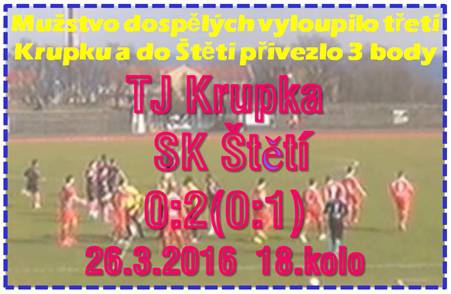 Hned první útok domácích jsme zastavili jen za cenu faulu a po volném přímém kopu čelili nepříjemné střele. Kloub v brance pěkným zákrokem zabránil nejhoršímu. V 6. minutě rychlonozí útočníci domácích zatopili v naší šestnáctce znova, ale brankář byl opět na svém místě. Úvod jsme přežili a pomalu jsme divákům připomněli, že do Krupky přijelo 1. mužstvo tabulky. Na ukazateli skóre se rozsvítila 22. minuta,když se míč od Poráče dostal až ke Slaničkovi, který se pěkně protáhl kolem obránce do šestnáctky a nezadržitelně poslal míč za záda bezmocného Trojana v brance na 1:0. Zaskočení domácí mohli inkasovat o 3 minuty později znova, ale hlavička Slaničky po rohu skončila vedle levé tyčky. Utkání se zrovna v rukavičkách nehrálo a kromě spousty žlutých karet se zahrávalo na obou stranách i hodně volných přímých kopů. Jeden z kopačky Stejskala, ale balón byl příliš dlouhý a skončil za brankou. Na druhé straně to zkoušel Rilke, ale z přímáku trefil jen zeď. Slabší chvilku si vybral v závěru poločasu Kloub, když neudržel po rohu míč, ale hráč Krupky naštěstí pro nás branku minul. Druhý poločas začali lépe domácí. Po pravé straně pláchnul Dominik Valenta, ale místo střely volil přihrávku, kterou jsme odkopem na roh zpacifikovali. V 54. minutě na branku Krupky osamocen postupoval Stejskal a jeho levačce chybělo pár centimetrů. Po hodině hry zamotal obranu Krupky Slanička, ale v rozhodujícím okamžiku ztratil nad míčem kontrolu. V 65. minutě udělal průvan v naší obraně jeden z hráčů Krupky, ale z těžkého úhlu trefit branku nedokázal. 15 minut před koncem musel hřiště po zásahu do hlavy od jednoho z protihráčů opustit pro podezření na otřes mozku náš brankář Lukáš Kloub. Přejeme mu rychlé uzdravení. Horečka v hledišti stoupala. Nervozita se přenesla i na hřiště a za nepublikovatelná slova na adresu rozhodčího musela v 75 minutě do kabin opora domácího týmu Emil Rilke. Hrát proti deseti nebývá ve fotbale často nic jednoduchého a navíc domácí to i za této situace nevzdali a pouštěli se do útočení. To byla příležitost štětského kolektivu pro rychlé brejky do otevřené obrany. Pěkně vystřelil Hrdý a jen těsně minul. V 88. minutě pojistku zatloukl Belák. Souboj jeden na jednoho vyhrál a stejně tak hezky poslal míč na 2:0 za záda brankáře. Za další minutu to mohlo být už 3:0, ale střelu Stejskala vyrazil brankář. Ještě větší šanci měl Slanička v 90. minutě, ale místo třešničky na dortu v podobě přihrávky na gól zvolil nepřesnou střelu. Zlobil se i Hrdý, který čekal balón od Stejskala, ale ten také volil nepřesnou střelu. Čestného úspěchu se domácí nedočkali ani ve 4. minutě nastavení, kdy byl proti střídající Michovský a skvěle zasáhl. Pak už na hřišti se závěrečným hvizdem rozhodčího vypukla velká radost za vítězství 3:0.